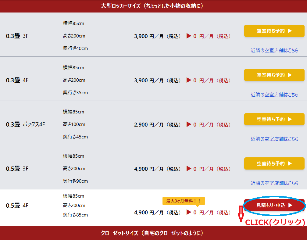ご自身の希望する広さやタイプなどを選んで、マルで囲んだ「見積り・申込」ボタンをクリック