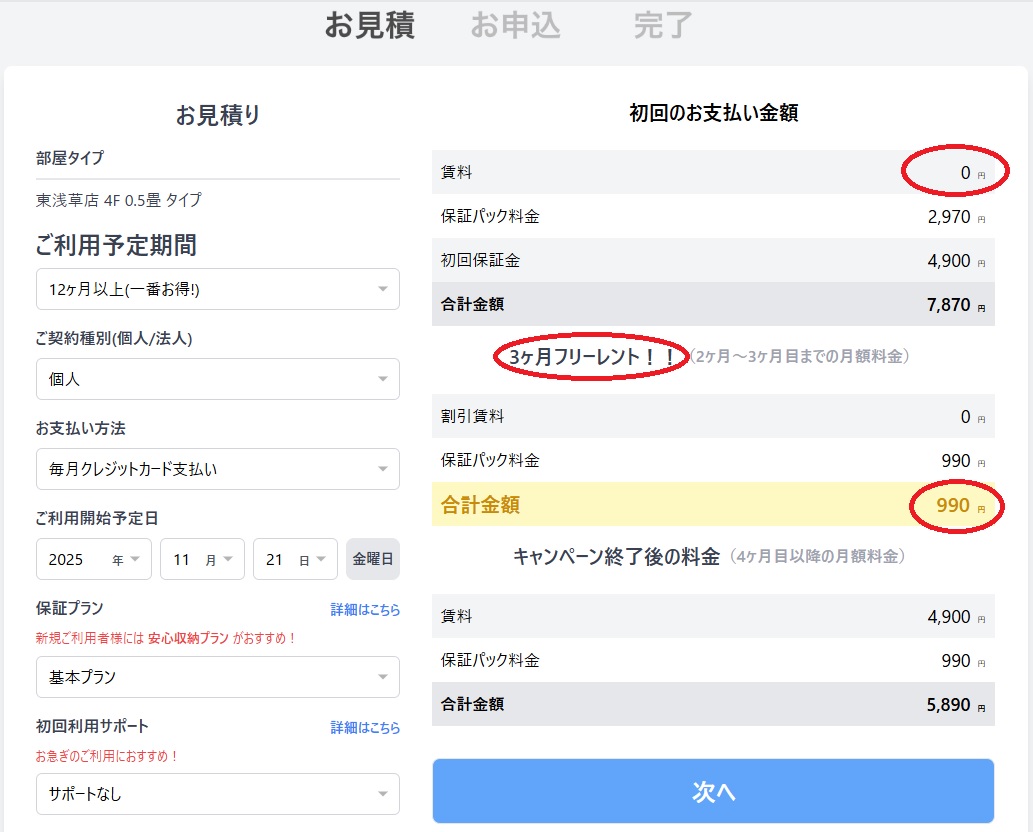 例えば公式サイトで「東京都」→「台東区」→「東浅草店」→「0.3~0.5畳」→「詳細を見る」→「見積り」の順で進んで行くと見積価格が出ますので下記のボタンから利用したい店舗を確認してみましょう!